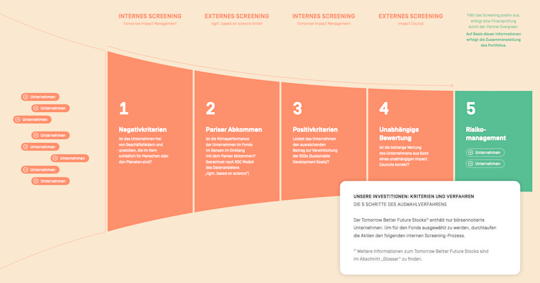 Die Anlagekriterien setzen sich aus Positiv- und Negativkriterien zusammen. Bei den Negativkriterien werden zum Beispiel Unternehmen aus den Branchen Rüstung, Massentierhaltung oder fossile Energien und die Unternehmen ausgeschlossen, die Praktiken von Steuervermeidung, Korruption oder Menschenrechtsverletzungen praktizieren. Um zu verstehen, welchen positiven Beitrag ein Unternehmen leistet, wird zudem geschaut, ob ein Unternehmen zur Verwirklichung der Nachhaltigkeitsziele der UN, den Sustainable Development Goals (SDGs), beiträgt. Abgeleitet von diesen 17 Zielen ist eine Liste an Positivkriterien entstanden, auf die jedes Unternehmen geprüft wird.