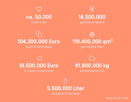 Wie zum Beispiel rund 30.000 neue Kund*innen, über 70 Millionen Euro mehr an Einlagen, fast 77.000.000 Quadratmeter mehr geschützter Wald oder über 30.000.000 kg mehr kompensiertes CO₂.